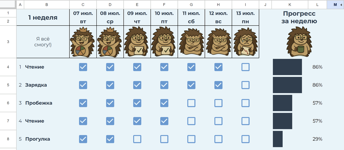 Думала, что таблицы только для работы. А тут прям полноценный трекер привычек. Очень удивлена, и приятно удивлена.